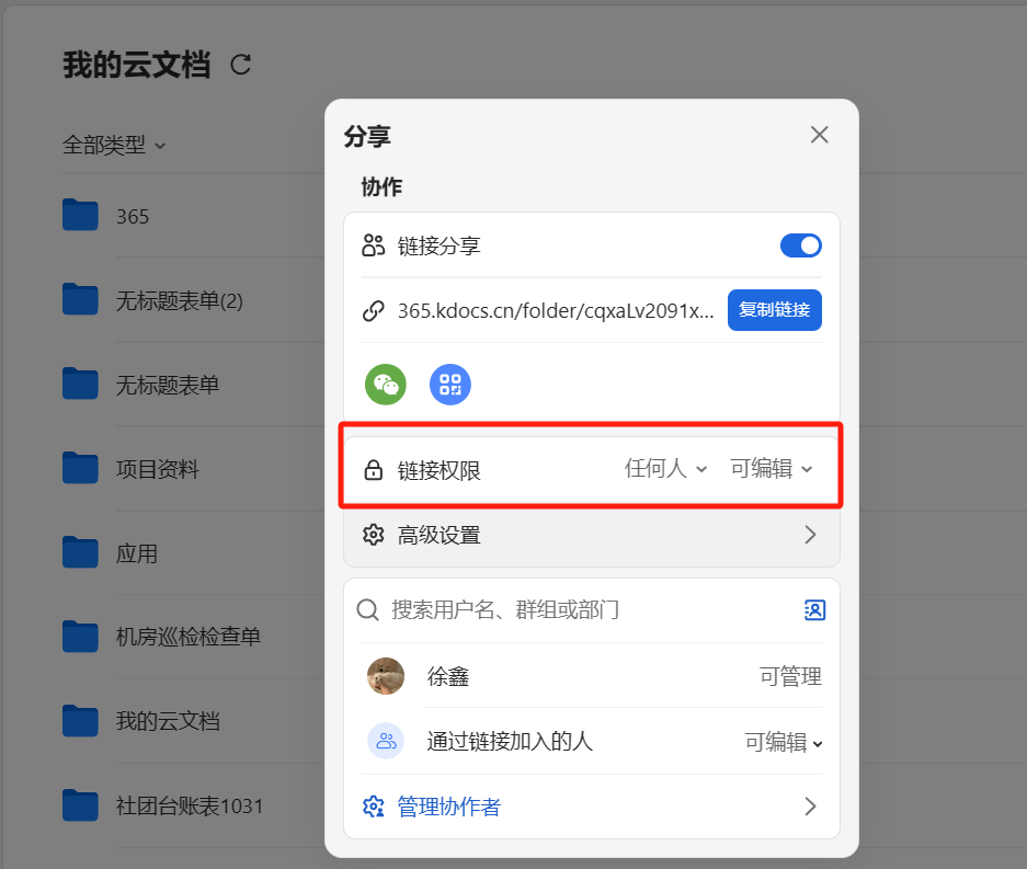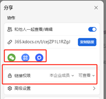 (2)这时会弹出一个文档权限设置页面,有以下五个选项,选择权限类型后,在弹窗里可点击【复制链接】或通过二维码/微信分享给他人,对方就能根据上一步设置的权限查看/编辑文档: