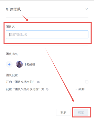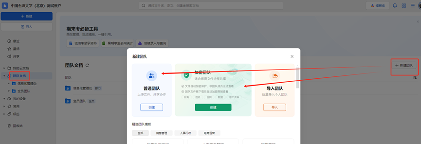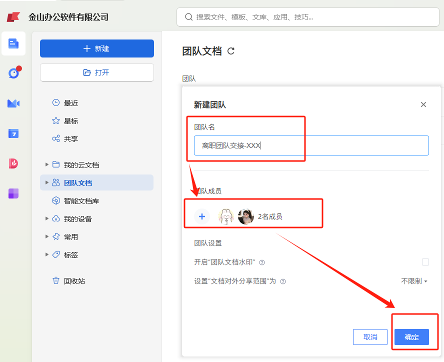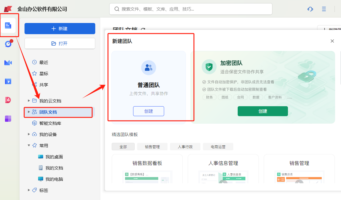 (1)登录金山文档,点击【+新建团队】,可根据将要创建的团队性质或文件管理要求,选择创建【普通团队】或【加密团队】,输入团队名称,选择需要加入团队的成员后点【确定】即可: