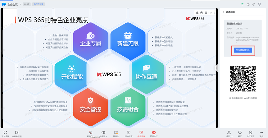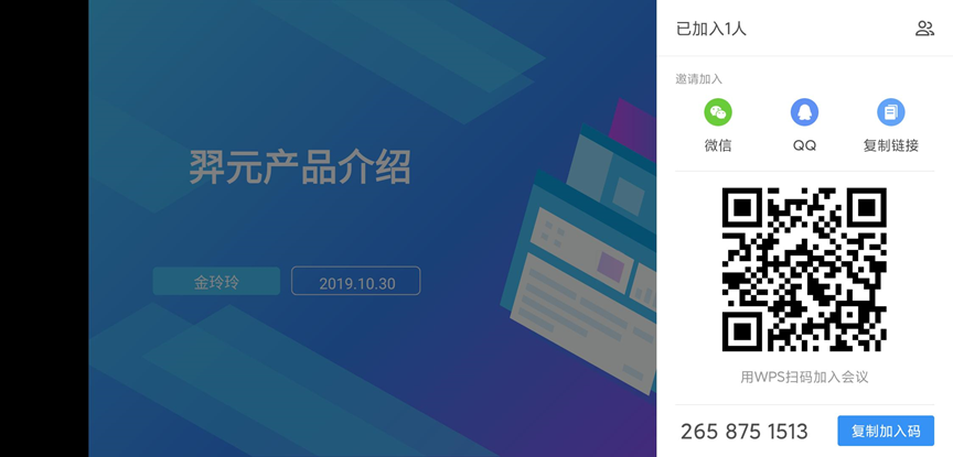 使用WPS365里的【远程会议】功能,你可以随时异地远程开会。通过链接加入会议,多人同时查看文档,文档自动跟随主讲人翻页。具体操作方法如下: