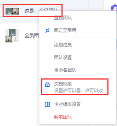 (3)为团队总体设置权限,在团队名字处点击鼠标右键,选择【文档权限】,团队名称右侧可选择【仅查看】/【可查看】/【可编辑】/【自定义】权限,团队成员可根据权限处理整个团队的文件: