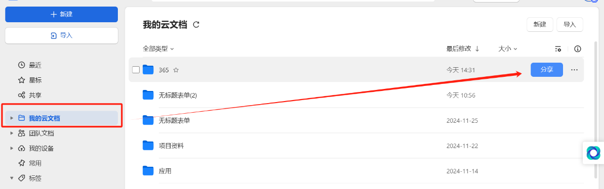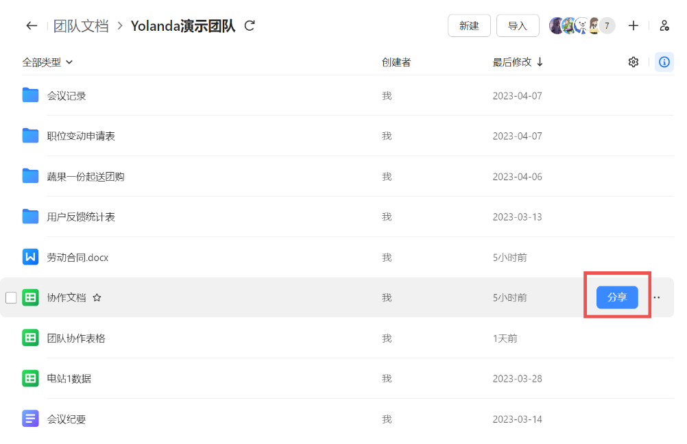 (1)将鼠标悬停在要分享的文档上,点击文档名右侧的【分享】:
