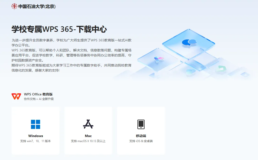 (2)可访问专属下载页面获取中国石油大学(北京)专属WPS全部版本客户端最新版本(包括Windows、Mac、以及移动端)