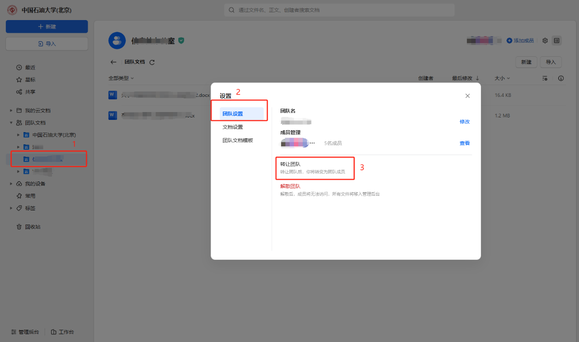 教职工、学生如有团队文档管理权限需在离职、退休、毕业、退学前转让团队所有者身份。