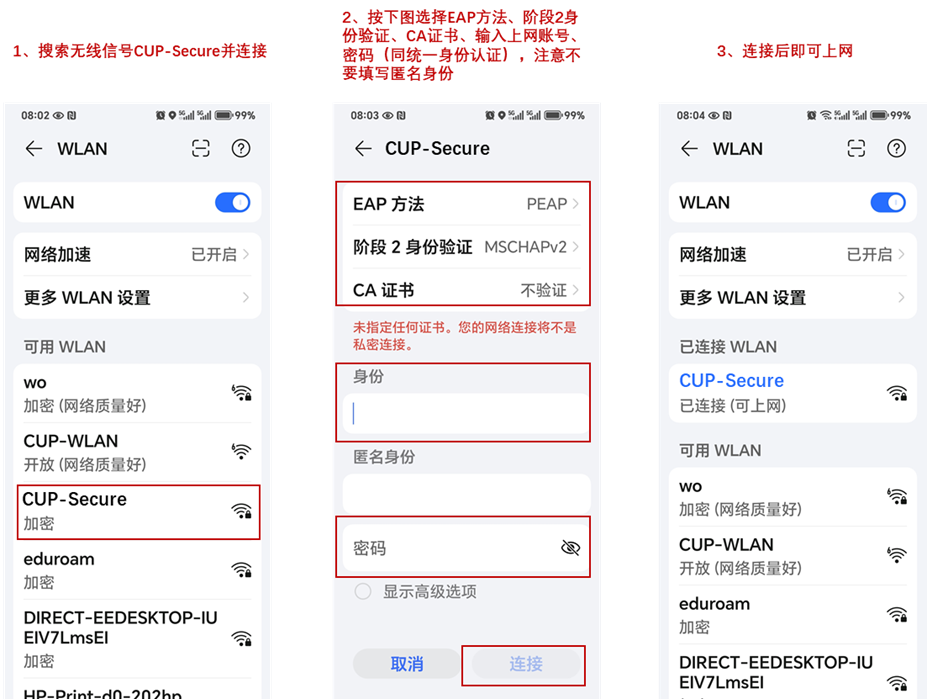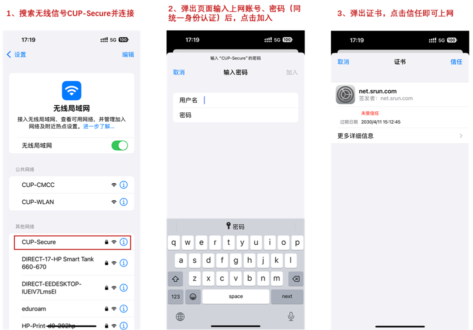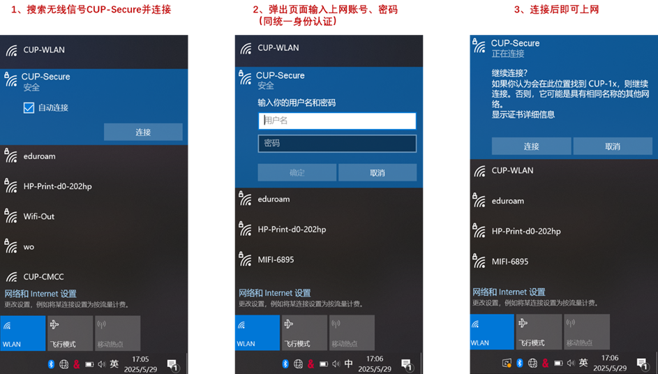 校园无线网络分为CUP-WLAN(portal认证)和CUP-Secure(802.1x)两个信号。