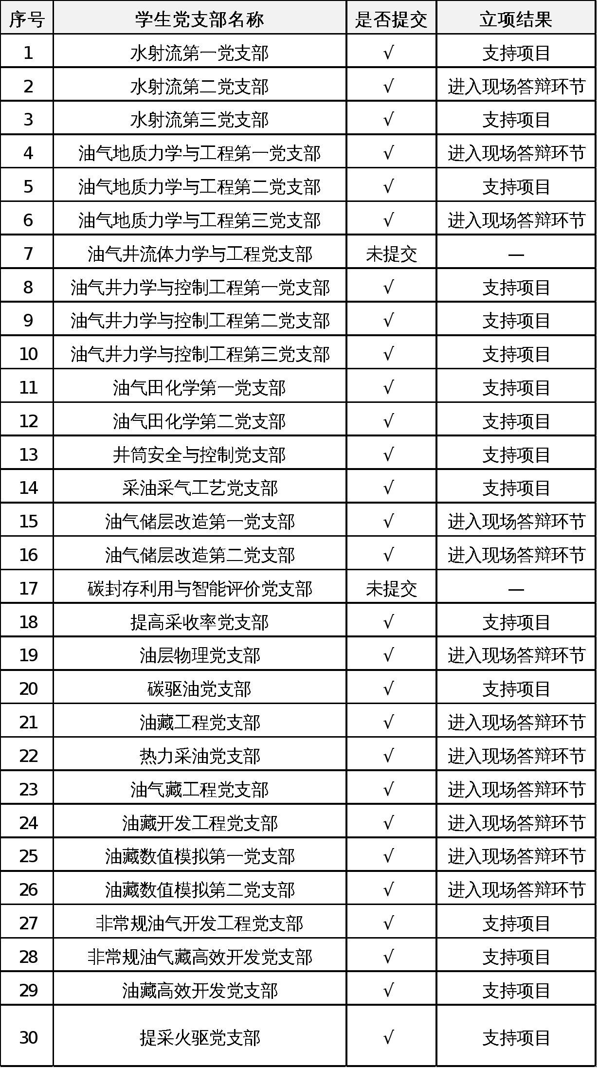经过对项目的研究方案、研究目标、预期成果、可行性分析等,共选出12个项目进入终评和16个支持项目,其中进入终评项目根据现场答辩情况和申报书评审情况评选出重点项目3个,一般项目9个,同时推荐重点项目参评学校第三批“党建工作样板支部”,立项结果公布如下: