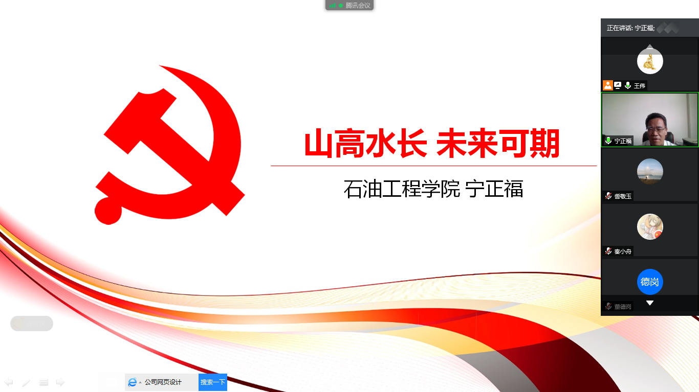 为深入学习习近平新时代中国特色社会主义思想和党的十九大精神,进一步加强毕业生党员党性修养和责任意识,强化党员身份意识、继续坚定理想信念,引导毕业生党员发挥示范作用,同时结合北京市疫情防控常态化要求,7月1日上午,石工学院党委书记宁正福以“山高水长,未来可期”为主题,线上为毕业生党员上了最后一堂党课。会议由党务秘书王伟主持。
