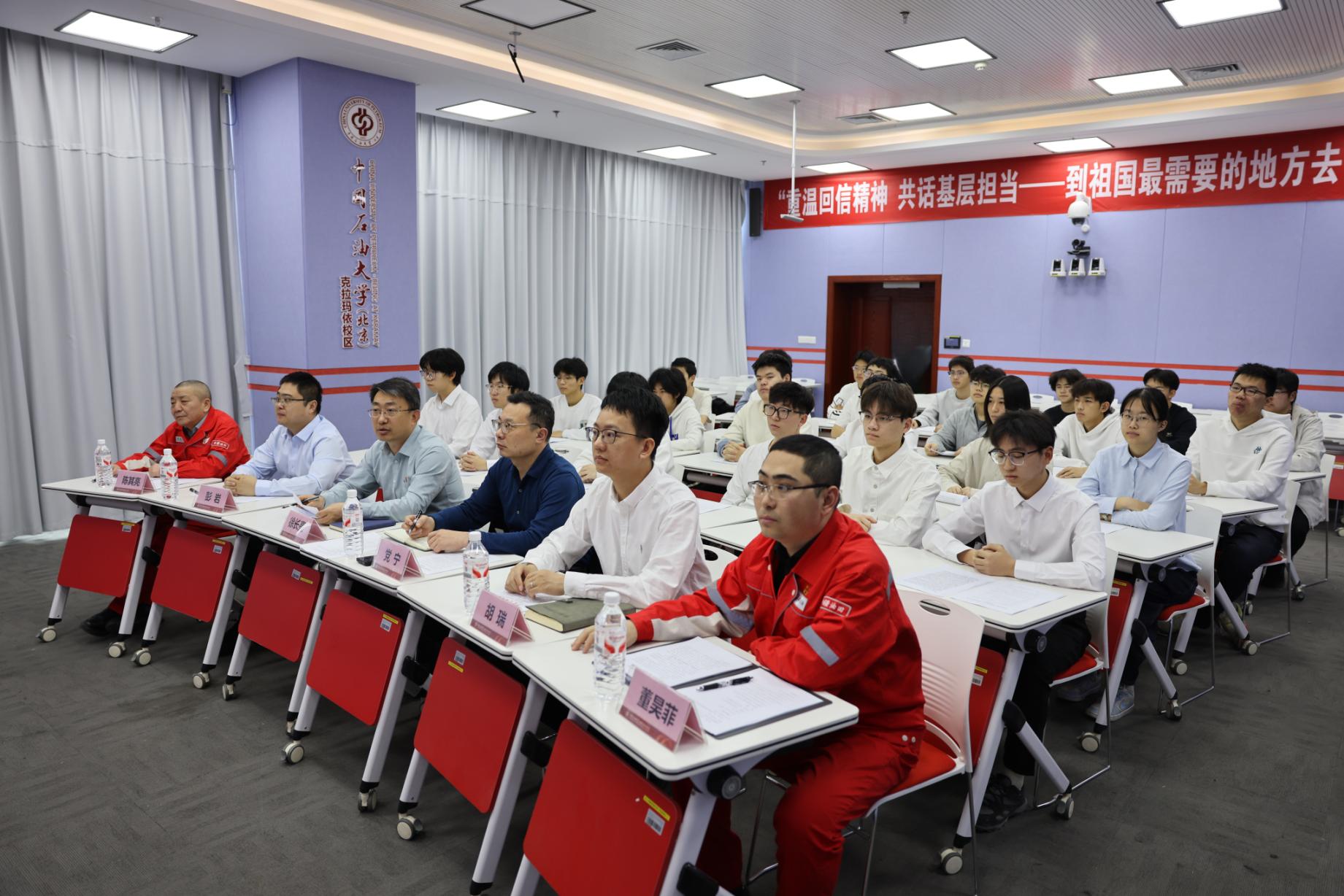 为深入学习贯彻习近平总书记重要回信精神,引导青年学子将个人理想融入党和国家事业发展全局,1月14日下午,在中国石油大学(北京)学习贯彻习近平总书记重要回信精神主题展厅,校本部石油工程2024级、2025级创新班与克拉玛依校区石油工程、资源勘查工程2025级创新班通过线上线下联学的方式举办“重温回信精神 ,共话基层担当——到祖国最需要的地方去”主题班会。学校党委副书记文永红,克拉玛依校区党委副书记、纪委书记徐长亮,全国五一劳动奖章、全国劳动模范称号获得者陈其亮,克拉玛依校区2020届资源勘查工程专业毕业生董昊菲,光明日报记者唐芊尔,学校相关职能部门及学院负责人参加班会。