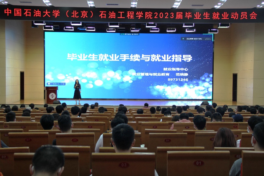 9月1日下午,石油工程学院举办2023届毕业生就业动员会,会议以线上线下相结合的方式举行。就业指导中心副主任范晓静,石油工程学院党委副书记刘东东,团委书记肖亚楠,毕业班辅导员及2023届本硕博毕业生近400人参会。