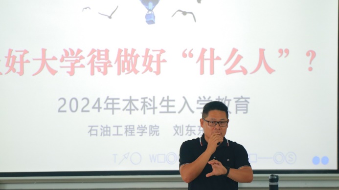 在本科入学教育第一讲中,石油工程学院党委副书记刘东东侧重于日常教育与管理方面,就学院基本概况、新修订的综合测评办法、违纪处理、生涯规划、文明礼貌以及宗教信仰等方面进行耐心细致的讲解。他叮嘱同学们尽快做好大学四年的规划,适应身份的转变,在保证学习成绩的同时注重全面发展,做能担重任、可堪大用的社会主义建设者和接班人。