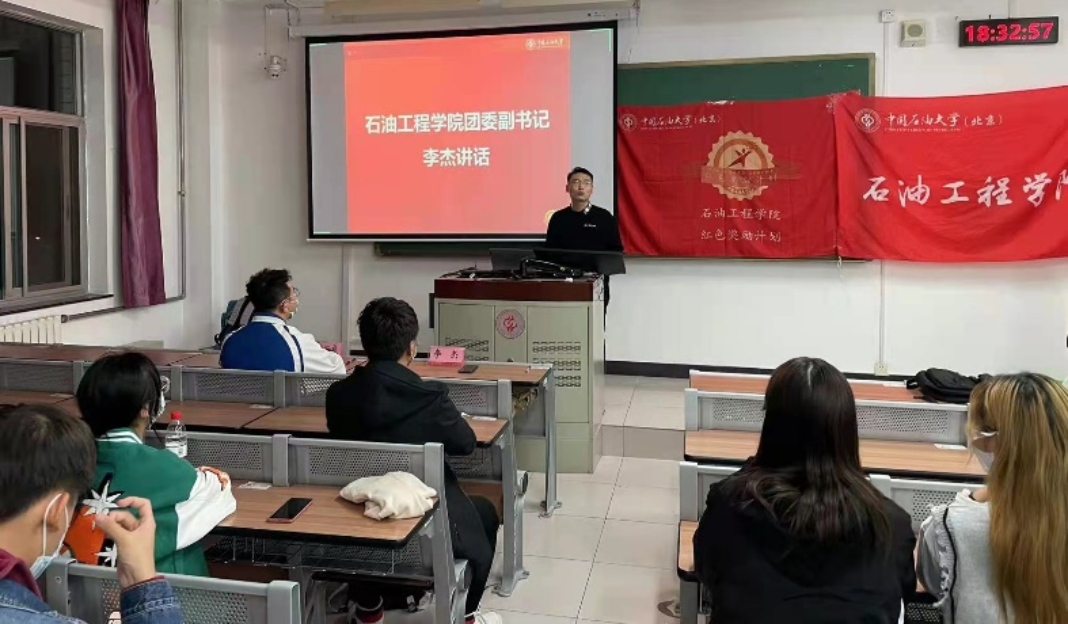首先,石油工程学院团委副书记李杰老师向同学们介绍了“红色奖励计划”的开展背景及必要性,并对各位新生从思想上、学习上、生活上提出几点要求,同时寄予了殷切希望。