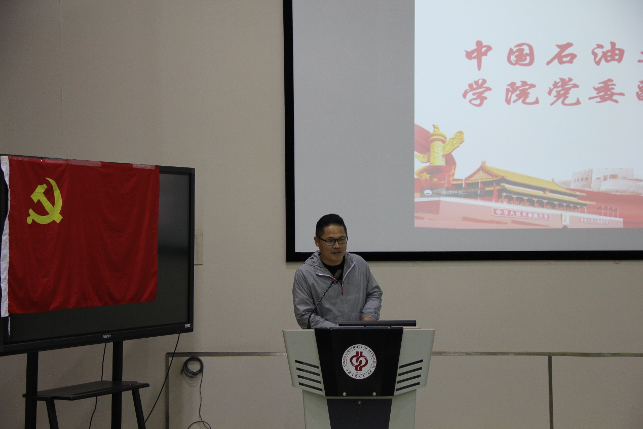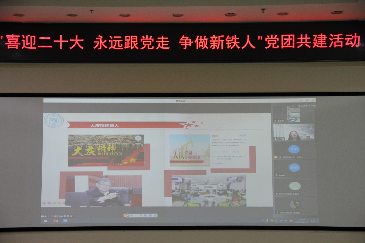 为迎接党的二十大胜利,传承大庆精神,弘扬铁人精神,2022年10月13日下午,中国石油大学(北京)石油工程学院油气田开发工程教工第一党支部、提高采收率党支部、石工本21-4团支部与东北石油大学外国语学院研究生党支部联合开展“喜迎二十大,永远跟党走,争做新铁人”党团共建活动。东北石油大学外国语学院党委书记杨国峰,中国石油大学(北京)石油工程学院党委副书记刘东东、团委书记肖亚楠、油气田开发工程第一党支部书记赵晓亮、石工本21-4班班主任刘哲宇,相关党支部党员、团支部团员出席活动。