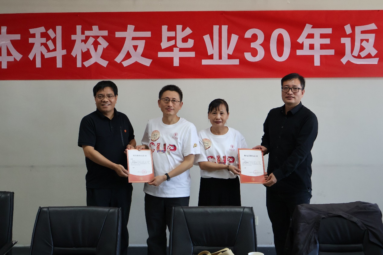座谈会上学院举行校友联络员聘任仪式,黄世军、宋先知为鲜成钢、肖中琼颁发校友联络员聘书。