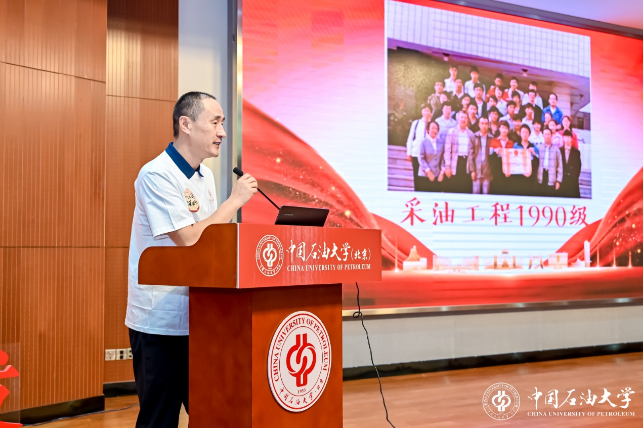 石油工程1994届本科毕业生、班长王京博代表学院毕业30周年校友上台发言。他回顾了在母校求学生活的时光,感恩母校和老师对自己及采油工程1990级的关爱和培养,为母校母院近年来取得的办学成就和高质量发展感到自豪。他表示,将以更加强烈的使命担当、更加饱满的精神状态,厚积薄发,开物成务,在自身岗位上为强国建设和民族复兴贡献力量,并祝愿母校母院宏图更展、再谱华章,早日建成能源领域特色鲜明的世界一流研究型大学。