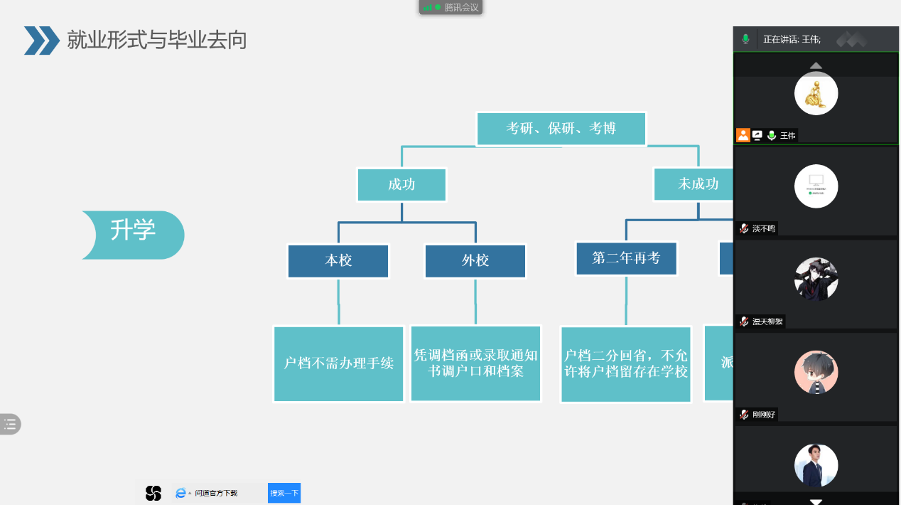 6月3日晚,石油工程学院2021届毕业生就业政策与就业手续报告会在线上平台腾讯会议(会议号:502953466)顺利召开。本次报告会由石油工程学院就业工作联系人王伟主讲,石工学院毕业班辅导员老师以及200余名毕业生参与其中。