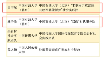 2023年11月13日,由中国青年报社主办的2023大学生社会实践成果“千校千项”网络展示活动公布获奖团队,中国石油大学(北京)石油工程学院的“七秩石子助湘行”、“石”志不渝志愿服务队、“双碳”时代服务队和“求取闽宁致富经,共绘西北能源梦”4支社会实践队伍获评优秀项目团队。