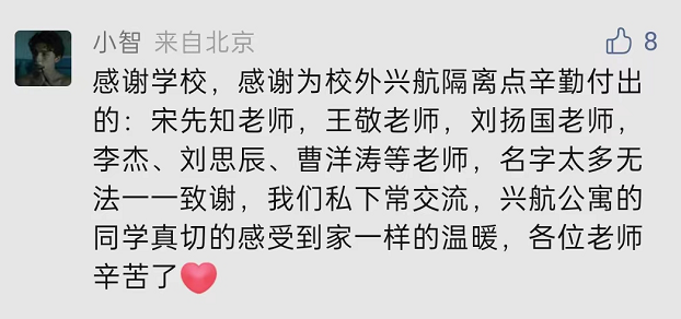 学生在哪里,老师就在哪里。宋执武老师进驻东校园参与服务保障工作。王小秋老师“丢”下“小家”中1岁多的小孩,义无反顾进驻润杰公寓这个“大家”,陪伴守护本科生。协调运来1台打印机,解决学生无法打印的难题。一位本科生突发腹痛尿结石,王老师克服困难第一时间将学生送到医院治疗,主动陪护、嘘寒问暖,用心守护、用爱陪伴。