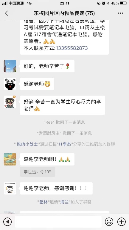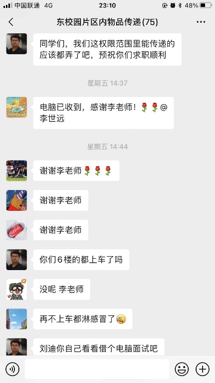 油气井工程系王小秋、宋执武、卢运虎、廖勤拙、王斌5位教师组成的志愿服务团队,奋战在任务最艰巨的东校园和润杰公寓。卢运虎老师主动请缨前往北校区工程东楼实验楼协助关闭部分仪器设备的电源,消除了火灾隐患。各系统计学生需求200多条,组织教师为毕业研究生运送电脑,解决了学生求职面试和线上考试无电脑的难题。