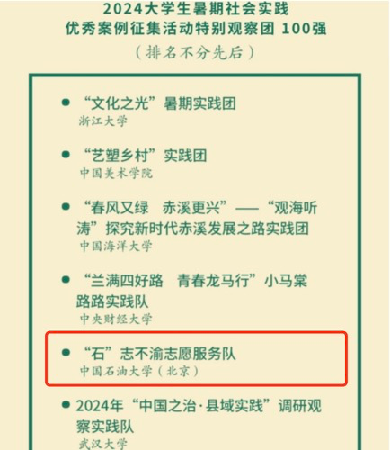 自活动启动以来,共吸引了全国925支各具特色的实践团队报名,根据各个报名团队的项目时段、成员、内容简介、活动亮点、预期成果等信息,通过层层审核筛选,遴选出 100 支2024 大学生暑期社会实践优秀案例征集活动特别观察团。学院“石”志不渝志愿服务队成功入选。