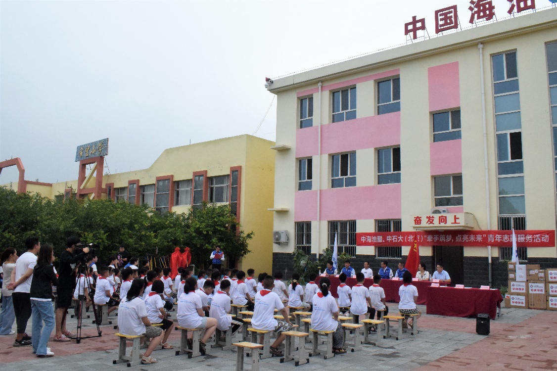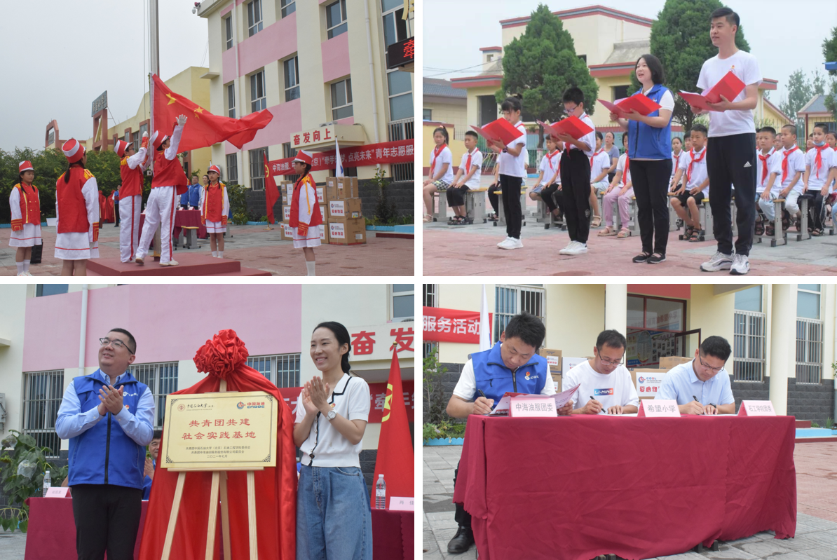 仪式前夕,中石大石油工程学院团委依托年度重点工作“百年行动”计划,充分发挥“铁人精神训练营”“领航团校2.0”等校内外“铁人班”的平台优势,按照“深输入、广输出”思路,联合中海油服团委,2次组织研开发19-2党支部、研开发20-2党支部、本19级党支部等17名实践团成员,前往河北训口中国海油COSL希望小学,开展了“校企牵手共绘美好· 童心向党助力振兴”“高举党旗跟党走·五育并举育新人”等以助力乡村振兴主题的红色“1+1”共建实践活动。