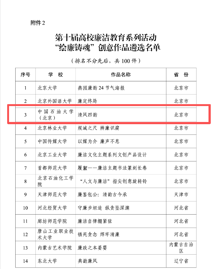本次教育部第十届高校廉洁教育系列活动,经自主申报、各省教育厅审核把关及专家评审,共遴选出“话廉修德”校园征文优秀作品101件、“绘廉铸魂”创意优秀作品100件,我院2份作品均入选(全校最多)。