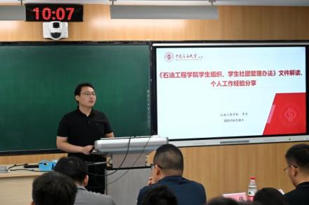 在制度建设与经验分享环节,辅导员李杰解读《石油工程学院学生组织、学生社团管理办法》,并围绕“什么是一名好的学生干部”展开交流。他强调,优秀学生干部应具备“有信念、有责任、有能力、有目标”的综合素质。