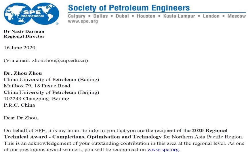国际石油工程师协会(SPE)近日宣布我校石油工程学院周舟副教授荣获SPE亚太区完井工程优化与技术成就奖(2020 SPE Regional Technical Award - Completions, Optimisation and Technology)。该奖项是奖励在完井技术与压裂增产上做出杰出贡献的研究者,每年在亚太区只评选1名获奖者,候选人来自东南亚和东北亚各个国家石油公司的工程师和科研学者,并需要得到多位国际石油工程领域著名学者的联合推荐。今年该技术成就奖是为了表彰周舟副教授在页岩气储层、深层碳酸盐岩储层和干热岩地热储层压裂改造领域的产学研一体化研究成果。