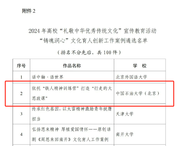 近日,教育部公布了2024年高校“礼敬中华优秀传统文化”宣传教育活动结果的名单,学院报送的《依托“铁人精神训练营”,打造“行走的大思政课”》入选“铸魂润心”文化育人创新工作案例。