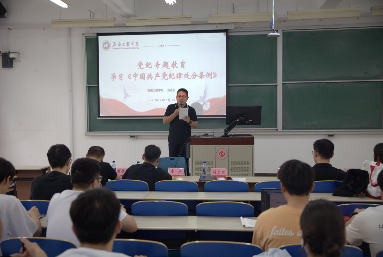 为深入学习贯彻习近平总书记关于加强党的纪律建设重要论述以及关于党纪学习教育重要讲话和重要指示精神,不断提升党员干部队伍综合素质能力,5月23日,石油工程学院党委副书记刘东东以“党纪专题教育——学习《中国共产党纪律处分条例》”为题,为全体学生党支部书记讲授党纪学习教育专题党课。