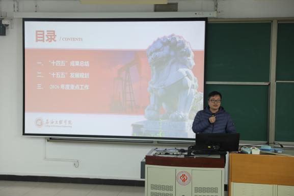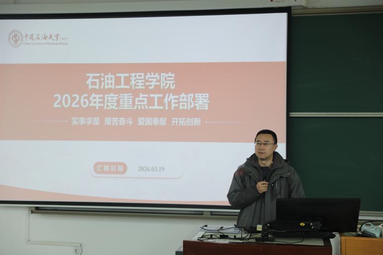 院长宋先知作学院工作报告。报告系统总结了学院“十四五”期间在党建、人才培养、科学研究、师资队伍、国际合作及学科建设等方面取得的突出成就。会议重点部署了学院“十五五”发展规划的“建设石油与天然气工程世界一流学科”这一总体目标与八项重点任务的具体举措。在此基础上,宋先知详细阐述了2026年度围绕党建、本科与研究生教育、学生工作、科研、师资、国际合作、学科建设及实验室安全等九个方面的具体工作安排,为学院新一年的发展指明了方向。