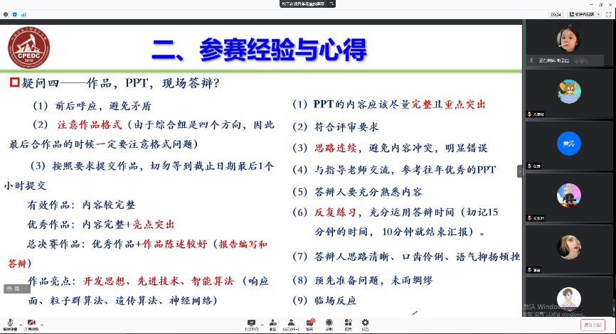 在提问环节中,参赛选手就时间规划、团队分工、突出创新、临场应变等方面与两位经验分享人交流。
