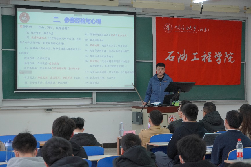 贾志豪和李培宇根据自身参赛经验,分别围绕参赛带来的收获和成长、经验与心得、赛题分析与建议三方面作经验分享。贾志豪建议参赛选手注意作品的“完整性、规范性、创新性”,抓住赛题的关键点,充分考虑现场的可实施性、经济评价和HSE合理性。李培宇从自己对作品精益求精的要求和现场答辩的心路历程讲起,鼓励参赛选手“敢下决心、坚定信心、保持恒心、不忘初心”,并提醒大家要与指导教师作周期性研讨,和队友相互协调,扬长避短。