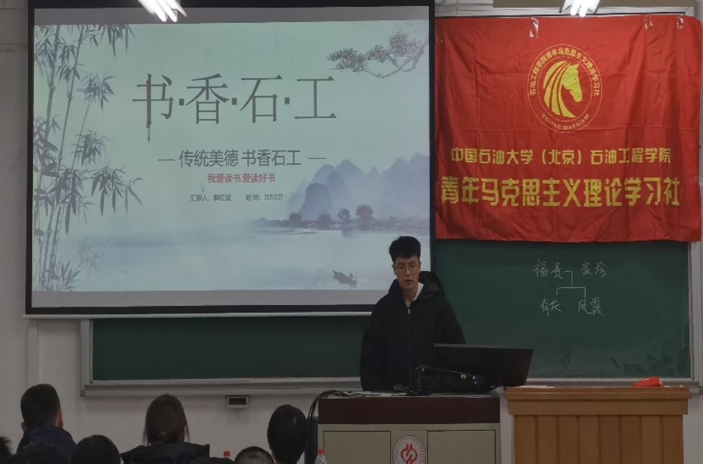 2021年12月27日晚,石油工程学院2021年书香石工总结仪式成功举行。本次活动旨在对书香石工活动进行总结和表彰,并邀请校图书馆尹成芳老师做《千方百计只为书》讲座,由石光工作室部长梁天成主持。参与本次活动的嘉宾有校图书馆负责图书推广的尹成芳、卜晶晶老师,石油工程学院团委副书记李杰、2021级辅导员王心贺。