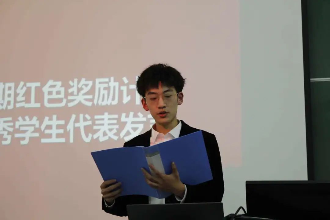 第一期红色奖励计划优秀学生代表王一帆发言,他给2020级本科生们分享了自己对红色奖励计划的理解并且提供了参与红色奖励计划的指导性建议。激励大家统筹活动安排,做好规划,提升综合素质。