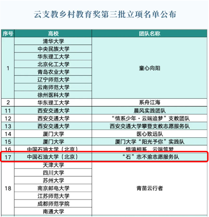近日,中国大学生知行促进计划、有爱有未来企业志愿行动、青年影响力创新中心、校园行动派联合公布了第六届全国云支教乡村教育奖第三批立项团队,中国石油大学(北京)“石”志不渝志愿服务队成功入选。