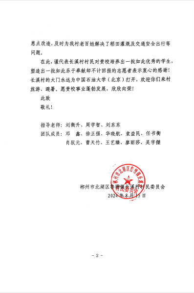 近日,湖南省郴州市北湖区鲁塘镇长溪村村民委员会向学校发来感谢信,对石油工程学院“青”石助湘行社会实践团到长溪村开展社会实践提出表扬和感谢。来信肯定2023年实践团怀着满腔热情,克服高温酷暑,来到长溪村开展了暑期社会实践活动,为当地留守儿童带来了清新的风,带来了知识的甘露,也带来了无尽的关怀和温暖,同时帮助村集体民宿产业进行广泛宣传。特别感谢的是今年上半年,实践团了解到长溪村沟渠长期水源不通导致耕地不能播种和4年未解决的公路重大安全隐患点,影响群众安全出行,协助长溪村整理相关材料,撰写调研报告,一同向上级有关部门申请,最终在郴州市委市政府、北湖区委区政府的亲切关怀和市区有关部门的大力支持下,为长溪村下发了200万专项经费,用于水渠疏通和道路交通隐患点改造,及时为长溪村老百姓解决了稻田灌溉及交通安全出行等问题。