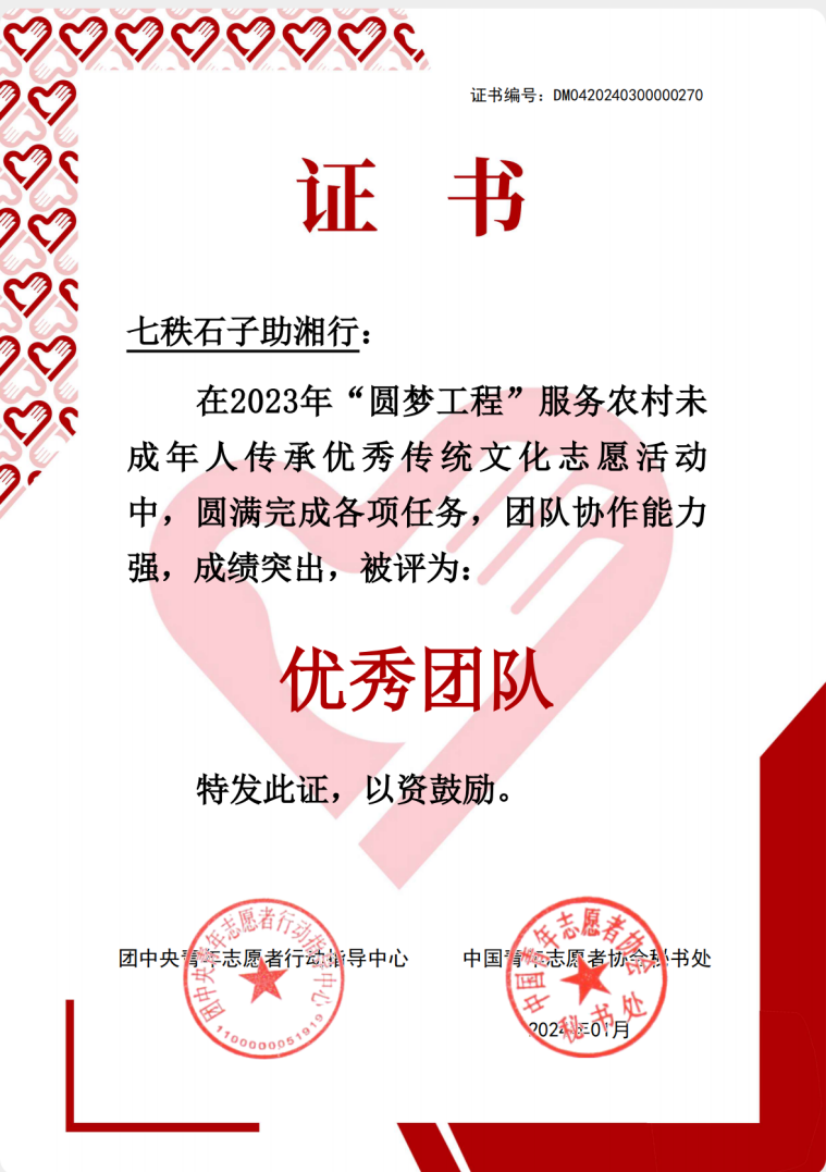 近日,中央文明办三局、团中央青年志愿者行动指导中心、中国青年志愿者协会秘书处共同主办的2023年“圆梦工程”服务农村未成年人传承优秀传统文化志愿服务优秀团队名单揭晓。学院“七秩石子助湘行”实践团成功获评。
