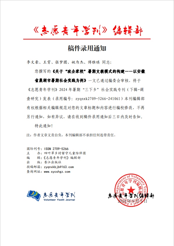 近日,《志愿青年学刊》2024年暑期“三下乡”社会实践专刊发布录刊结果,学院“石”志不渝志愿服务队撰写的《关于“政企家校”暑期支教模式的构建——以安徽省巢湖市暑期社会实践为例》文章录刊发表(录用编号:zyqnxk2709-5266-241061)。