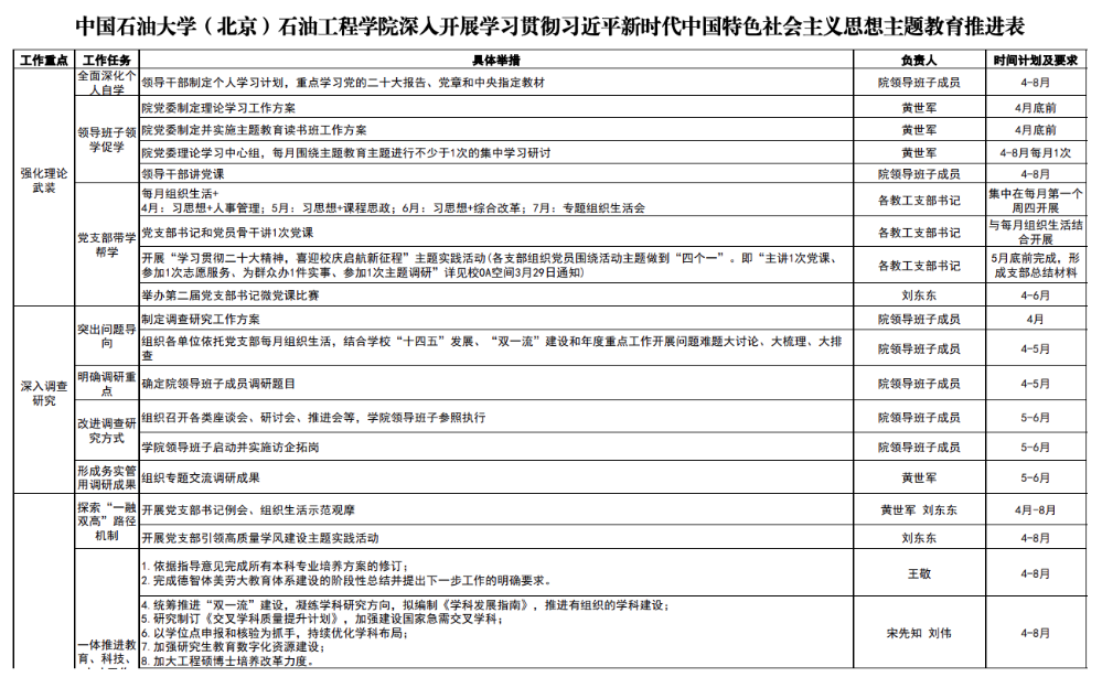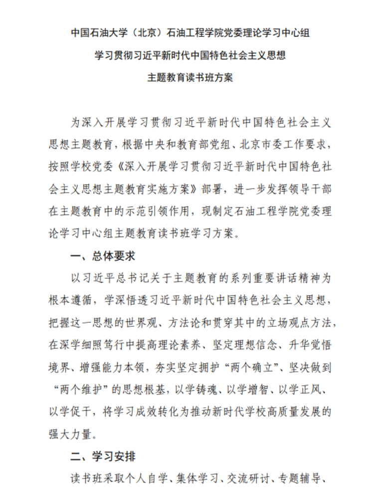 学习贯彻习近平新时代中国特色社会主义思想主题教育全面启动以来,中石大石油工程学院把开展好主题教育作为重要政治任务,牢牢把握“学思想、强党性、重实践、建新功”总要求,把扎实开展主题教育作为坚定拥护“两个确立”、坚决做到“两个维护”的实际行动,将理论学习、调查研究、检视整改、推动发展等融合贯通,实施了“两案四单”工程,高质量推进主题教育走深走实。
