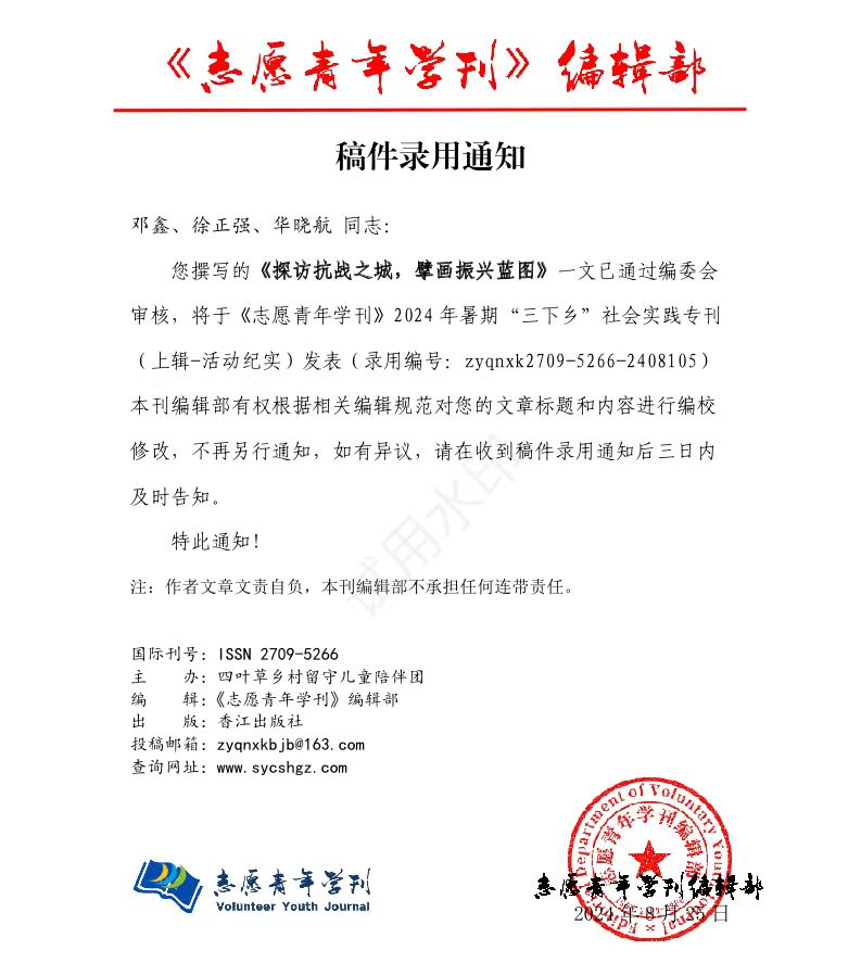 近日,《志愿青年学刊》2024年暑期“三下乡”社会实践专刊发布录刊结果,中石大石油工程学院青“石”助湘行实践团撰写的《探访抗战之城,擘画振兴蓝图》文章录刊发表(录用编号:zyqnxk2709-5266-2408105)。