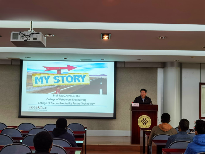 会上,芮振华教授首先以流利的英文介绍了自己教育背景及工作经历,接着就石油工程技术专业目前形势、近几年就业情况等方面向国际学生做了简要介绍,与国际学生分享了自己对于当前世界能源发展趋势的看法,简单介绍了碳达峰、碳中和及CCUS的概念及远景目标,希望大家在校期间珍惜时间,努力学习,全面发展,做好职业规划,为未来发展做好准备。国际学生借此机会向芮振华教授提出了自己在大学期间面对课程、升学和就业的种种困惑。芮振华教授结合自己的专业知识和丰富的经验,帮助同学们梳理思路,耐心解答了同学们大到未来规划,小到专业细节方面的种种问题。