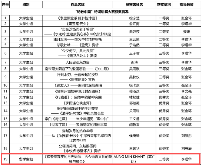 在“诗教中国”诗词讲解大赛全国赛中,2023级缅甸籍数学与应用数学专业本科生高广达(AUNG MIN KHANT)凭借对古典诗词的独到解读与生动讲解,荣获优秀奖。同期,在“诵读中国”经典诵读大赛全国赛中,2023级蒙古籍市场营销专业本科生阿扎吉雅(BATSUREN AZZAYA)以声情并茂的朗诵演绎中华经典,同样荣获优秀奖。这两项成绩充分体现了我院留学生在中华语言文化学习与实践中的卓越成效。这些成果不仅是个人的荣誉,更是国际教育学院长期致力于推动中华优秀传统文化国际传播、深化“中文+文化”育人模式的生动体现。