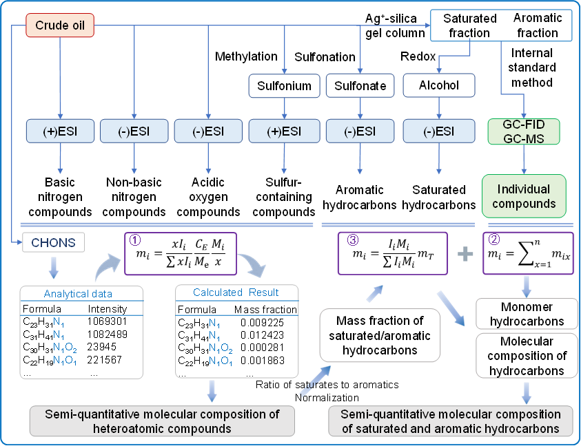 实现原油分子组成定量分析是“石油组学”的重要课题。在这项研究中,我们提出了一种原油全组分分子组成半定量表征策略。采用电喷雾电离-高分辨质谱结合多种化学衍生化方法,对原油中烃类及各类杂原子化合物分子组成进行选择性分析;通过气相色谱技术定量分析了原油中单体化合物组成。基于元素组成和组分含量归一化方法,将不同分析方法得到的各类化合物分子组成和单体化合物数据进行定量处理和整合。从碳数、等效双键数和平均分子组成参数等多个维度定量分析了4个原油中12类化合物分子组成,量化揭示了原油分子组成特征和多样性。进一步将原油分馏为石脑油、中间馏分油、减压馏分油和减压渣油四个馏分,分别对各馏分分子组成进行半定量分析,并基于各馏分蒸馏收率整合得到原油分子组成半定量数据。对比了由馏分整合得到的原油半定量分子组成和原油全组分半定量分析方法得到的分子组成结果,此外,比较了半定量分子组成数据衍生的原油H/C比与元素组成分析所得H/C比的偏差,结果表明尽管原油全组分分子组成半定量分析方法仍存在一定偏差,但其结果是可控和可接受的。