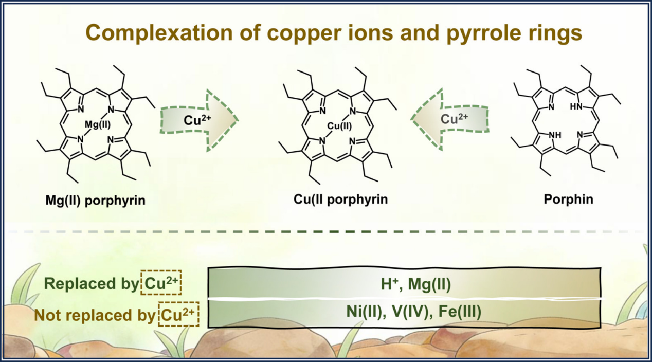 团队以模型化合物为基准,结合超高效液相色谱 - 高分辨质谱(UPLC-Orbitrap MS)技术对该方法开展系统验证。结果显示,该方法具有优异的选择性:叶绿素a 铜置换效率超95%,卟吩置换效率超89%;同时,地质样品中广泛存在的 Ni (II)、V (IV)、Fe (III) 卟啉不受反应干扰,保持稳定不被置换。