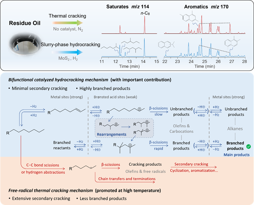 浆态床加氢裂化是一项具有潜力的劣质重油升级技术,但由于重油组成和反应体系的复杂性,其反应机理存在争议。在课题组前期的工作中(Fuel 2023;351:128981; Energy Fuels 2023;37(16):11743-53; Pet Sci 2025;22(2):884-93),已经通过高分辨率质谱(HR MS)技术对渣油浆态床加氢裂化过程中不同类型化合物的分子转化规律进行了充分的研究,但仍然难以从机理层面获得认识。在本工作中,通过柱色谱分离和GC-MS分析,对热裂化和浆态床加氢裂化产物中饱和烃和芳烃的单体烃成分进行了分析,并基于此对反应机理进行了讨论。