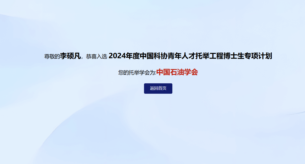 2022级博士研究生李硕凡近期入选首批中国科协青年人才托举工程博士生专项计划,托举学会为中国石油学会。