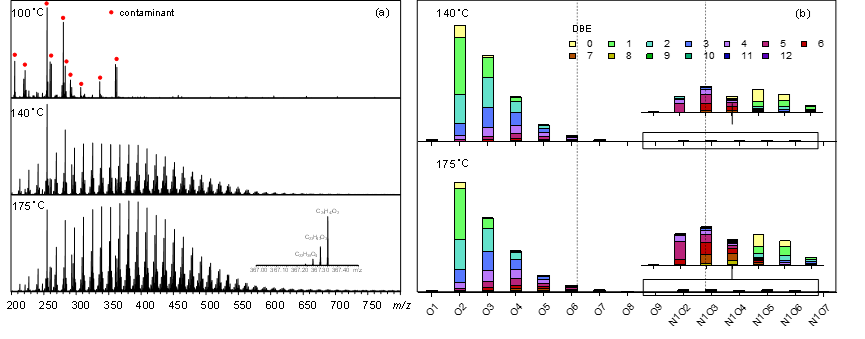 本文中,润滑油基础油的热老化试验的目的是模拟润滑油使用场景,在有氧的环境中通过加热使油品氧化,通过改变加热温度(100℃、140℃、175℃),获得不同的老化产物。随后通过元素分析、SARA 组分分析、傅里叶变换红外光谱(FTIR)及氢氘交换实验结合高分辨质谱分析等手段,详细揭示了润滑油基础油热老化产物的分子组成,提高了对复杂氧化过程的认识。