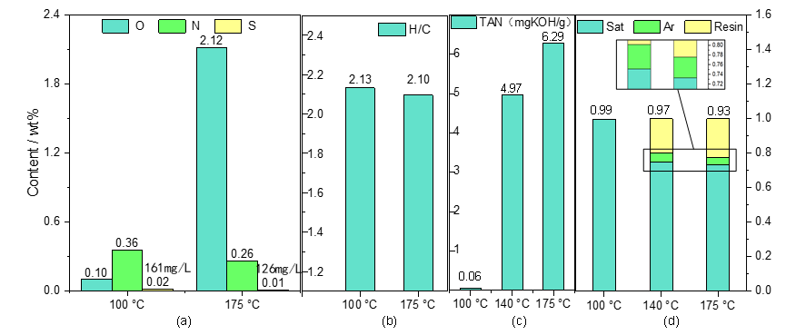 通过各种分析技术对热老化基础油进行了综合表征。结果表明,在高温老化过程中,烃类化合物普遍发生氧化,导致氧和胶质组分含量显著增加(图1)。