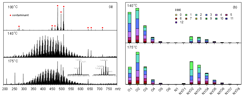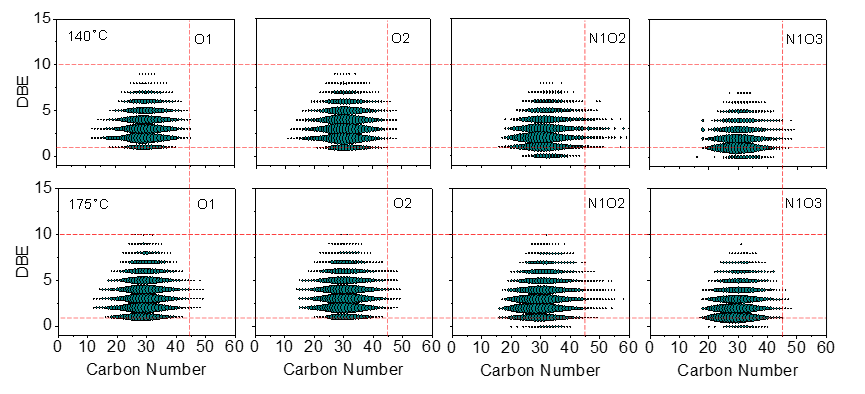 100 ℃老化油中主要检测到污染物,140 ℃、175 ℃老化油在 m/z 300 - 600 区间出现钟形分布峰,主要为 CHO、CHON 类化合物,其中 O₁ - O₅类含氧化合物占比高,O₂类化合物最丰富,同时检测到少量 N₁O₂ - N₁O₆类含氮氧化合物,且其相对丰度随温度升高显著增加,表明碱性含氮化合物可能加速氧化。含氧化合物碳数集中在 C₁₅ - C₄₅,等效双键(DBE)值显示其源于环烷烃氧化,且 175℃老化油中高 DBE 值化合物更多,氧化程度更高。