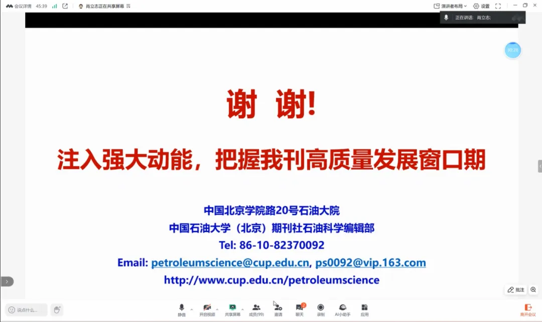 编辑部成员分别介绍各栏目工作情况。与会专家就当前形势下Petroleum Science 如何实现高质量发展展开交流研讨,从如何提升期刊国际影响力、进一步发挥