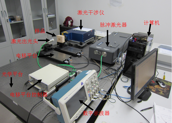 性能指标:Tolar-1053固体激光器:波长1053nm,脉宽100ns,输出能量10mJ;TEMPO-2D激光干涉器:面外灵敏度2*10-7nm(W/Hz)1/2, 带宽10KHz-10MHz,激光能量300mW(532nm),透镜焦距30-100mm